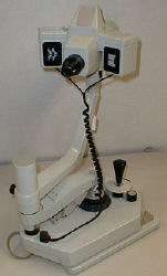The J-S Keratometer uses 2 coloured mires set along a graduated arc and are able to be moved closer together or further apart, adjusting the size of the object until the image is a predetermined size and thus the doubled images are just touching end to end. At this point the image size is known, as is the distance from the corneal surface and the object size can be measured, thus radius of curvature can be calculated and corneal dioptric power deduced.