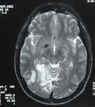Answer aT-2 weighted MRI scan. Answer bRight occipital lobe infarction. Answer cLeft homonymous hemianopia.