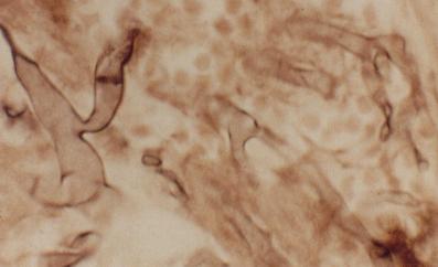 In an immunocompromised patient, the development of an acute inflammation in the orbit and hard palate strongly suggest mucormycosis. Rhizopus and Mucor species (Figure 3) are the principal pathogens. They typically multiply within the sinus and nasal turbinates. They penetrate the muscular walls of the arteries and spread by vascular and direct extension into the orbit. The orbital involvement produces diplopia, chemosis and proptosis which may be mistaken for bacterial orbital cellulitis. A sharply delineated area of necrosis strictly respecting the midline, may appear in the hard palate.