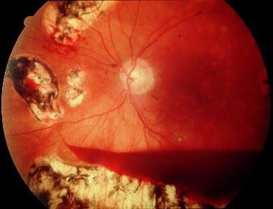 Subhyaloid haemorrhage (note the fluid level) in an eye